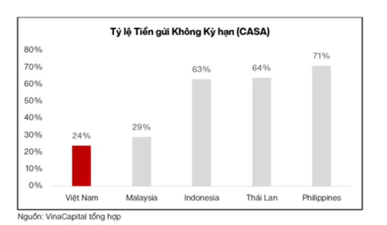 Tuy nhiên, VinaCapital lưu ý rằng khả năng cải thiện biên lãi ròng của các ngân hàng sẽ bị giới hạn, khi tỷ lệ tiền gửi không kỳ hạn (CASA) hiện chỉ ở mức 20–25%.
