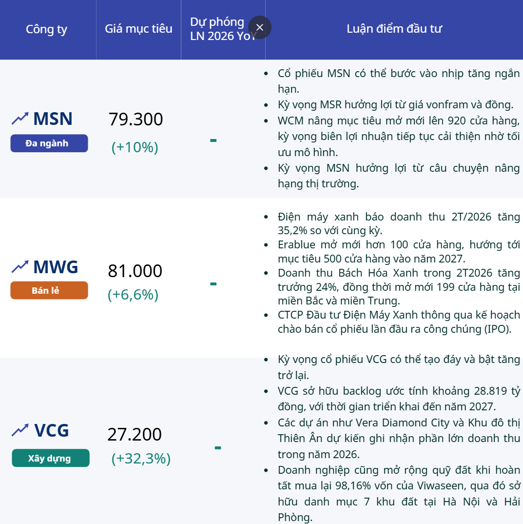 Các công ty chứng khoán đưa ra khuyến nghị trái chiều với MSN, MWG và VCG, trong đó MSN và VCG được đánh giá tích cực với dư địa tăng giá, còn MWG vẫn đối mặt áp lực điều chỉnh trong ngắn hạn.