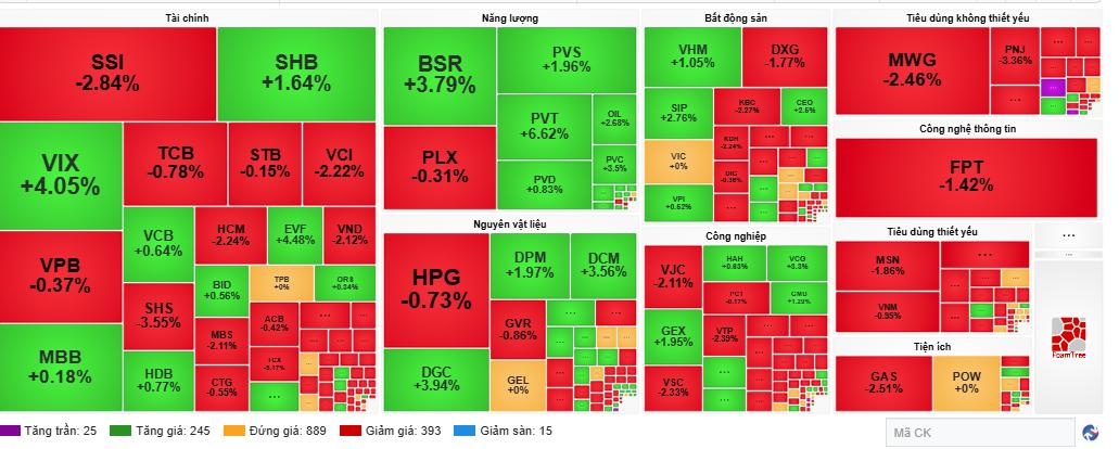 Độ rộng thị trường nghiêng rõ về phía giảm khi có 393 mã giảm so với 245 mã tăng, còn lại 889 mã đứng giá.