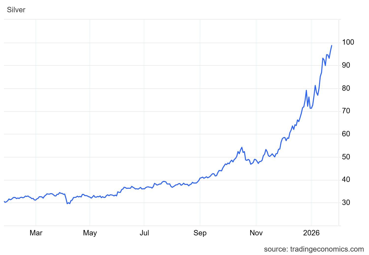 Cùng thời điểm, giá bạc thế giới tăng thêm 2,7%, leo lên mức 98,7 USD/ounce, mức cao nhất trong nhiều năm. Đà tăng mạnh của bạc diễn ra trong bối cảnh thị trường toàn cầu chịu tác động đồng thời từ căng thẳng địa chính trị, và kỳ vọng Cục Dự trữ Liên bang Mỹ (Fed) sẽ bước vào chu kỳ cắt giảm lãi suất trong năm 2026.
