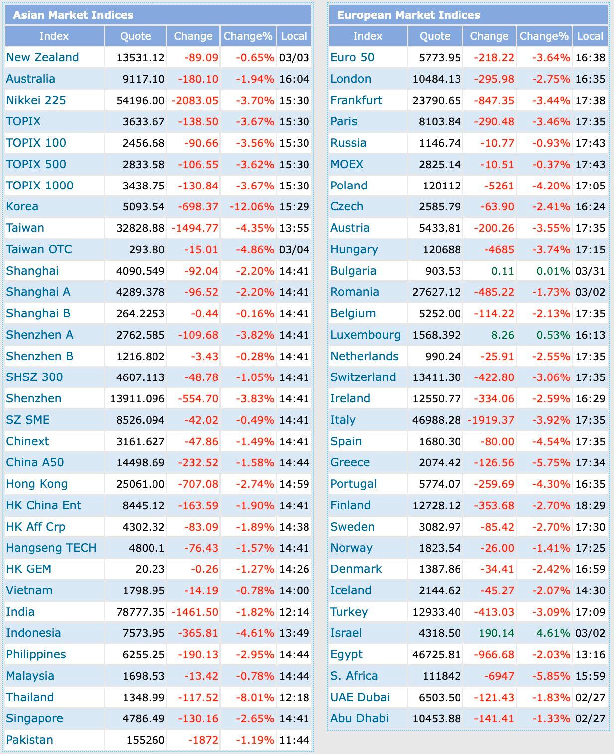 Tại Hàn Quốc, chỉ số KOSPI có thời điểm mất tới 12% trong phiên, kích hoạt cơ chế ngắt mạch tự động. Chỉ sau hai phiên, thị trường này đã “bốc hơi” khoảng 20%, xóa sạch thành quả tăng giá kể từ đầu tháng 2. Đây là một trong những mức điều chỉnh mạnh nhất của KOSPI trong nhiều tháng trở lại đây.