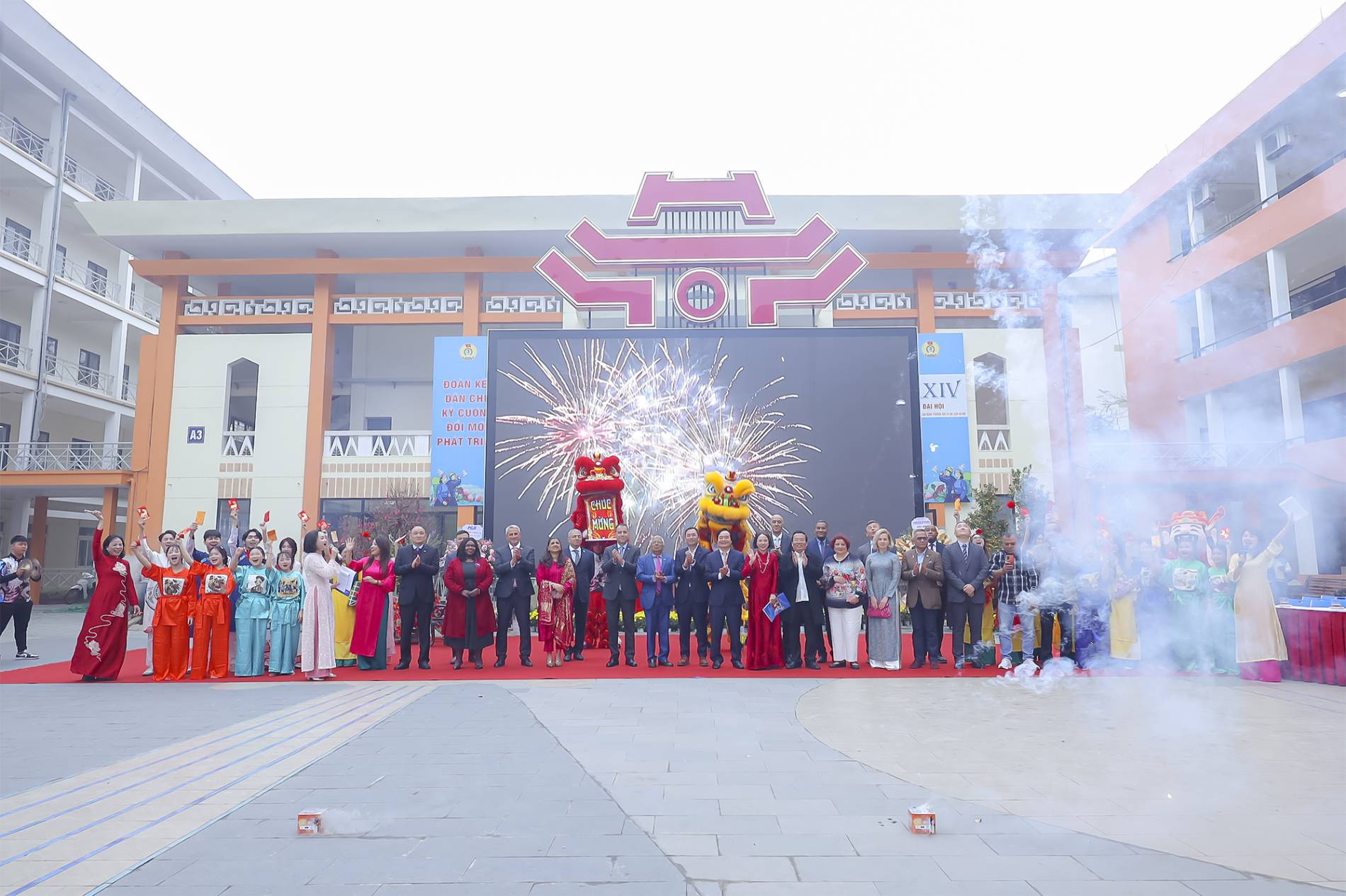 Các đại biểu cùng Hiệu trưởng và cán bộ Nhà trường chụp ảnh lưu niệm.