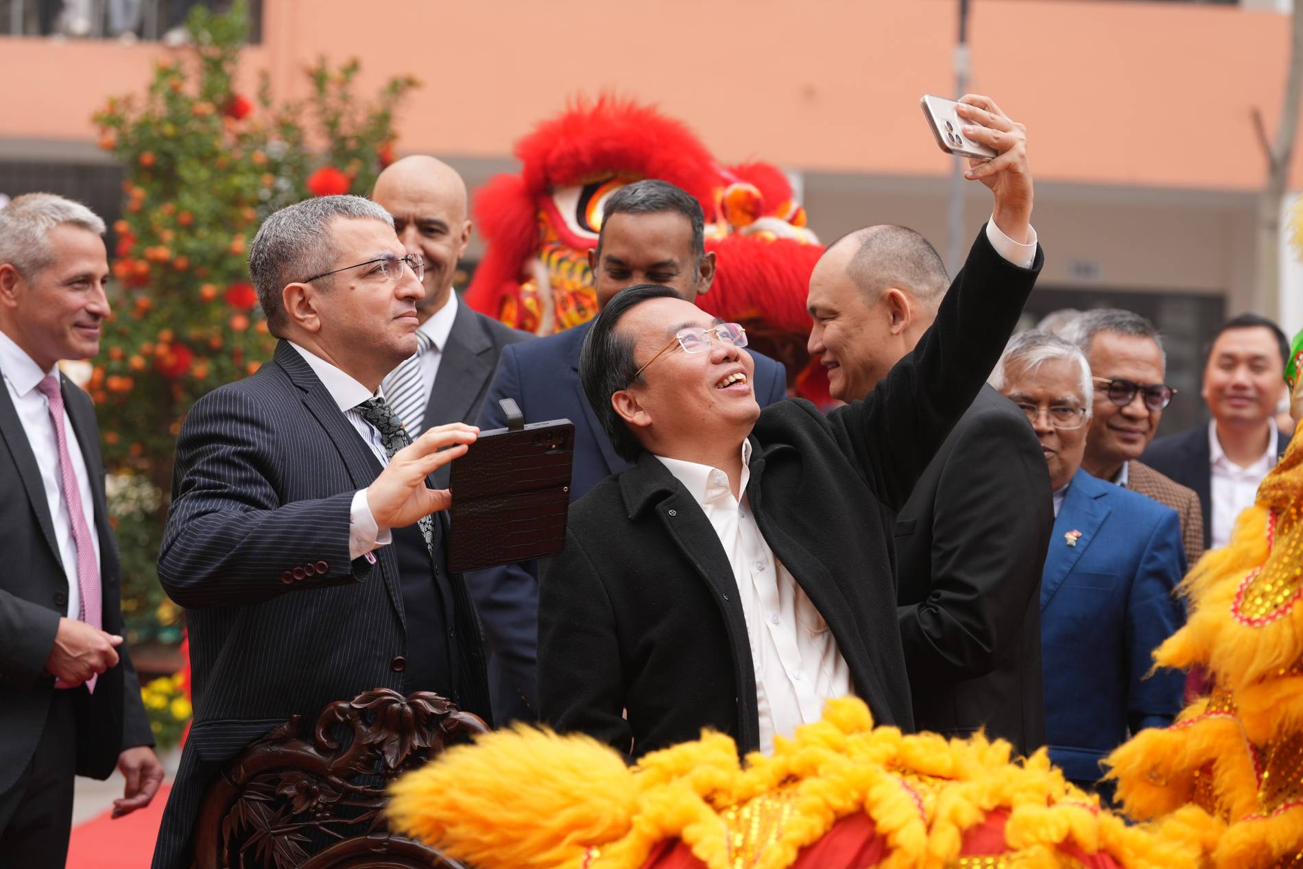 Đại diện các cơ quan ngoại giao và đại sứ quán chụp ảnh tại gian hàng.