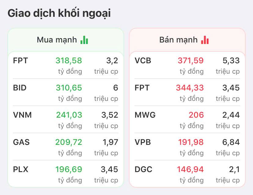 Về giao dịch khối ngoại, nhà đầu tư nước ngoài quay lại mua ròng 154 tỉ đồng, chấm dứt chuỗi 4 phiên bán ròng liên tiếp. Cụ thể, khối này mua vào 4.198 tỉ đồng và bán ra 4.043 tỉ đồng. VCB bị bán ròng mạnh nhất với giá trị 195 tỉ đồng, tiếp đến là DGC 106 tỉ đồng và MWG 95 tỉ đồng. Ở chiều ngược lại, BID được mua ròng mạnh nhất 218 tỉ đồng, theo sau là VNM 185 tỉ đồng.