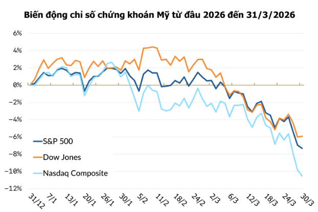 Dù phiên cuối tháng ghi nhận sự bứt phá mạnh, bức tranh tổng thể của thị trường vẫn mang màu sắc thận trọng. Trong tháng 03, S&P 500 giảm 5,1%, Dow Jones Industrial Average giảm 5,4% và Nasdaq Composite giảm 4,8%. Tính chung quý I/2026, Nasdaq giảm hơn 7%, S&P 500 giảm 4,6% và Dow Jones giảm 3,6%, cho thấy xu hướng điều chỉnh vẫn chiếm ưu thế.