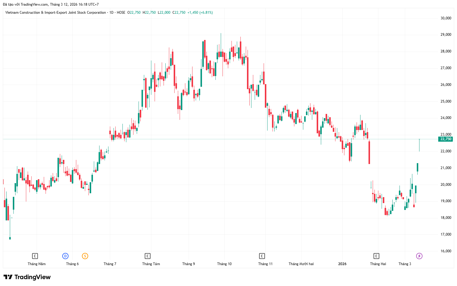 Phiên giao dịch ngày 12/03/2026, cổ phiếu VCG của Tổng CTCP Xuất nhập khẩu và Xây dựng Việt Nam (Vinaconex) tiếp tục tăng trần lên mức 22.750 đồng/cổ phiếu. Đây là phiên tăng trần thứ ba liên tiếp của mã này, nâng tổng mức tăng trong ba phiên lên hơn 20%. Vốn hóa thị trường của Vinaconex theo đó đạt gần 15.000 tỷ đồng.