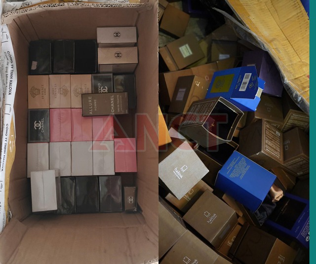 Quá trình khám xét, các đơn vị chức năng đã tạm giữ số lượng lớn tang vật, bao gồm: hơn 1.200 chai, hộp nước hoa thành phẩm mang các nhãn hiệu nổi tiếng như ALLURE, ACQUA DI GIÒ, COCO CHANEL, DIOR, LELABO…; hơn 130 lít nước hoa đã pha chế sẵn; 646 kg vỏ hộp mang nhãn hiệu nước hoa nổi tiếng; hơn 12.400 vỏ chai đựng nước hoa; hơn 18.000 nhãn hiệu nước hoa các loại và 04 máy chuyên dụng để sản xuất nước hoa.