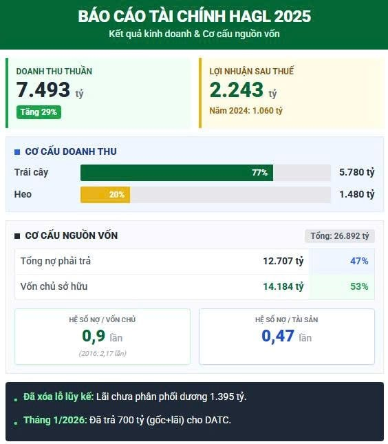Nhờ kết quả kinh doanh cải thiện và xử lý dứt điểm nhiều khoản lỗ lịch sử, HAGL ghi nhận lợi nhuận sau thuế 2.243 tỷ đồng, qua đó xóa sạch lỗ lũy kế và chuyển sang lợi nhuận chưa phân phối dương gần 1.400 tỷ đồng.