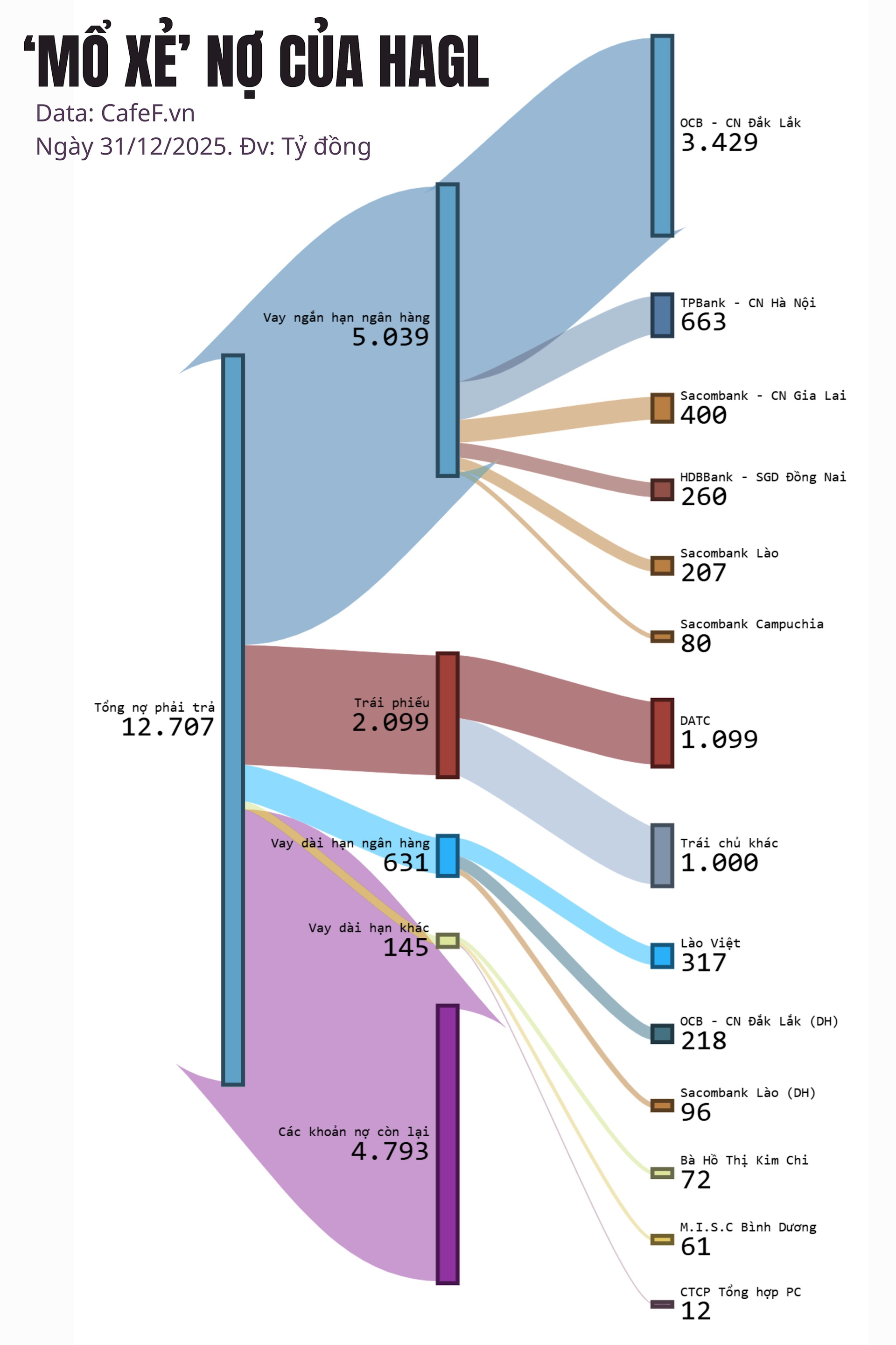 So với mức đỉnh 36.114 tỷ đồng năm 2016, quy mô nợ của HAGL đã thu hẹp đáng kể. Tại cuối năm 2025, nợ vay tài chính chiếm phần lớn trong tổng nợ, trong đó: