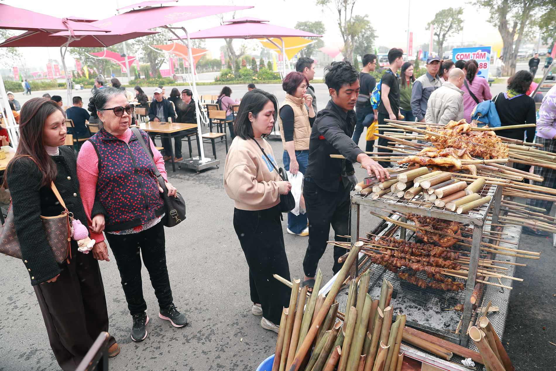 Ẩm thực tại Hội chợ Mùa Xuân 2026 không mang tính chất “ăn nhanh” đại trà, mà là sự chắt lọc tinh túy của các vùng miền. Tại đây, câu chuyện văn hóa được kể qua từng món ăn. Du khách có thể bắt gặp hình ảnh cả gia đình quây quần bên mẹt bún ốc nguội Hà Nội thanh tao, hay xuýt xoa bên xiên thịt rừng nướng nóng hổi thơm mùi lá móc mật.
