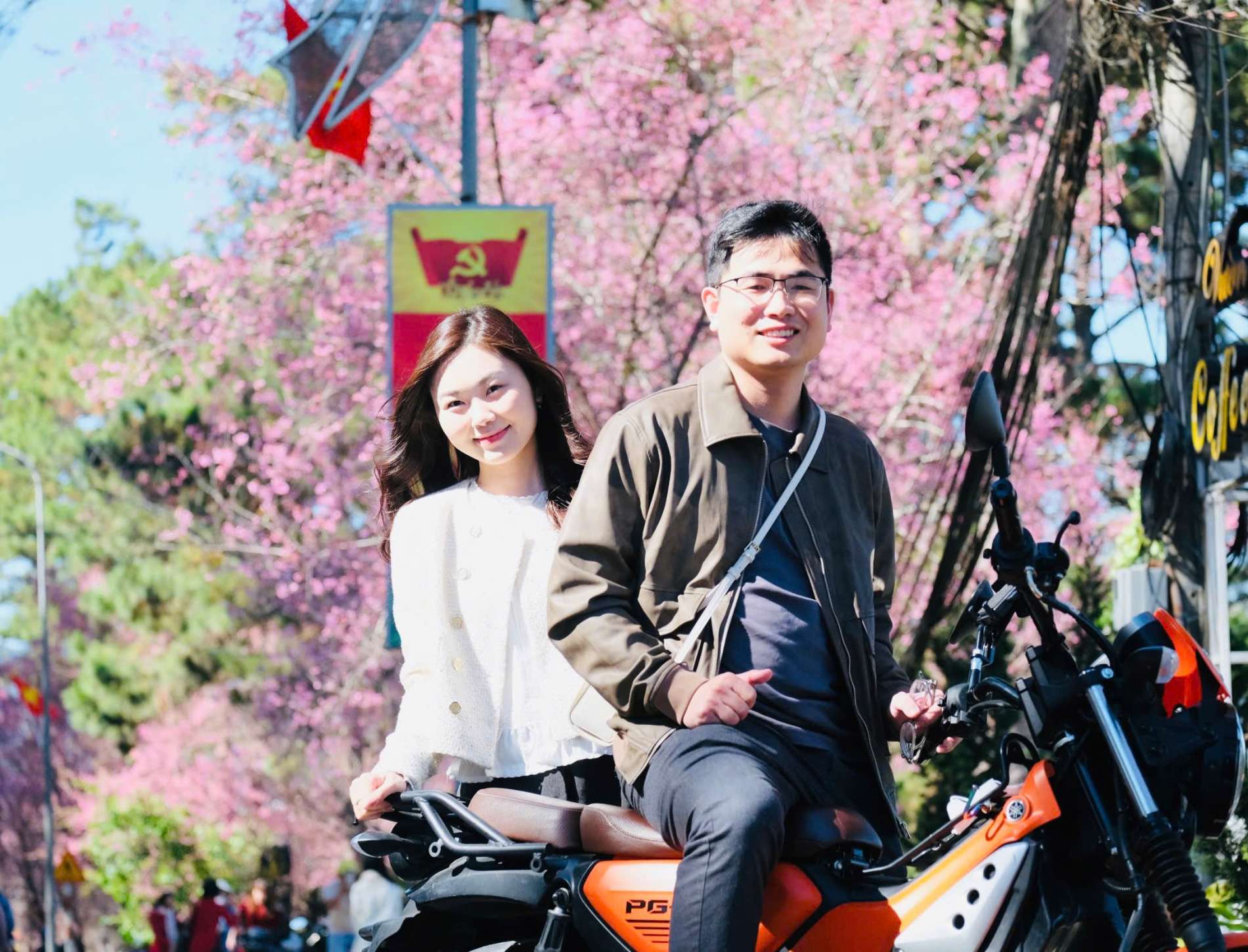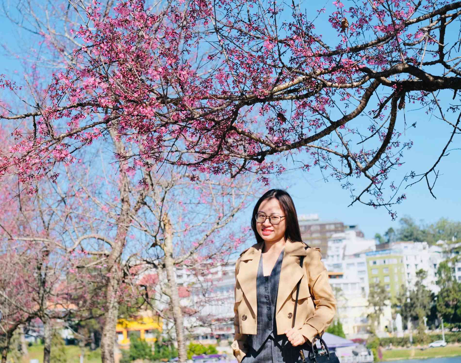Trong tà áo rực rỡ, du khách ghi lại kỷ niệm giữa không gian tràn nhập sắc xuân, khi mai anh đào bung nở khắp phố núi Đà Lạt.