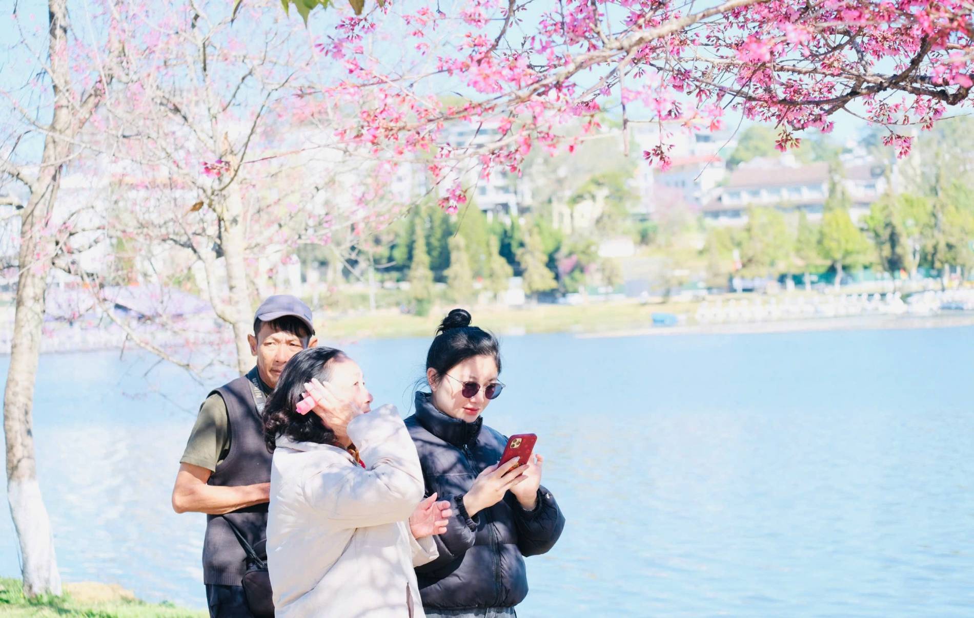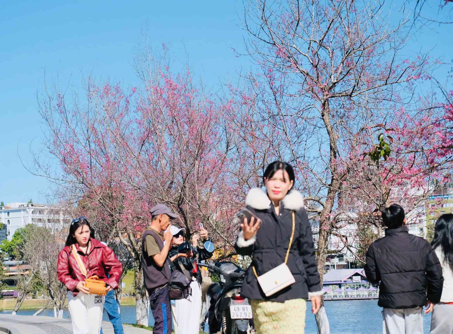 Du khách dạo bước dưới tán mai anh đào nở rộ ven Hồ Xuân Hương, lưu lại khoảnh khắc xuân dịu dàng giữa lòng Đà Lạt.