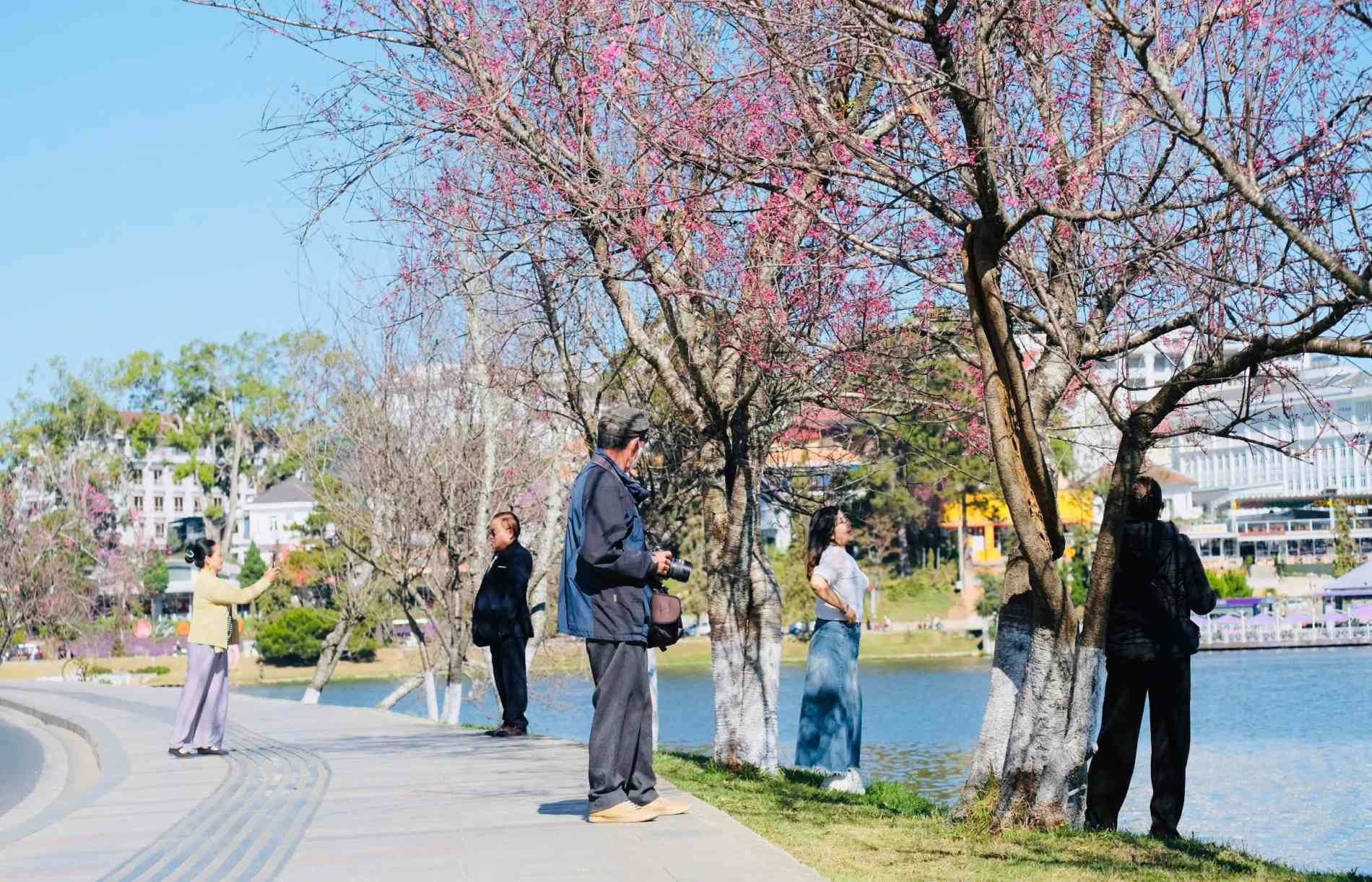 Từ khu vực hồ Xuân Hương, các tuyến đường trung tâm như Trần Hưng Đạo, Hùng Vương, Đinh Tiên Hoàng đến những con dốc quanh co ở vùng ven, sắc hoa phớt hồng trải dài, tạo nên bức tranh dịu dàng giữa không gian phố núi. Không khí vì thế cũng trở nên rộn ràng hơn khi dòng người tìm đến thưởng lãm, ghi lại những khoảnh khắc giao mùa đặc trưng của thành phố cao nguyên.