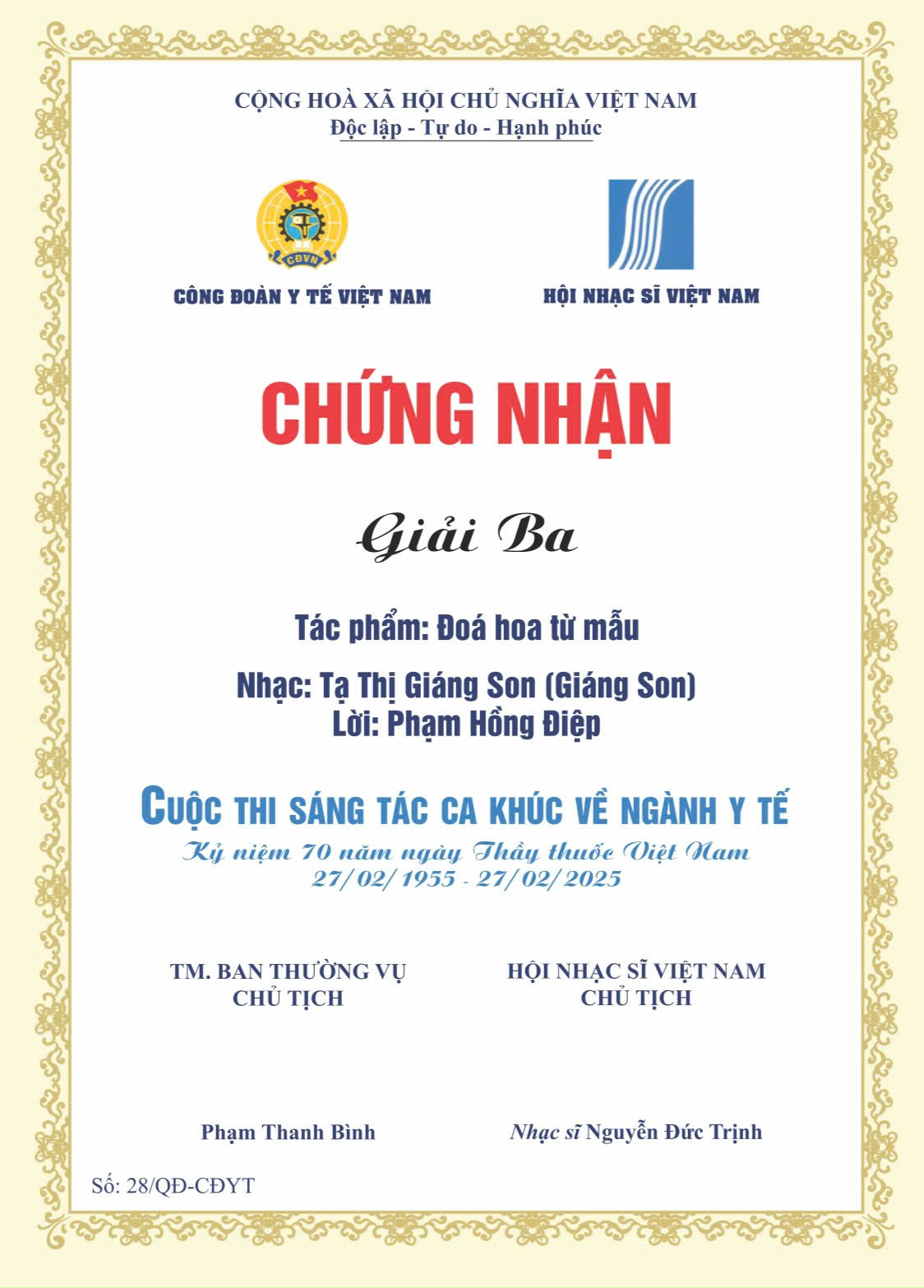 Chào mừng kỷ niệm 71 năm Ngày Thầy thuốc Việt Nam, Tạp chí Kinh tế Môi trường giới thiệu ca khúc “Đóa hoa từ mẫu" - tác phẩm đã đoạt Giải Ba tại Cuộc thi sáng tác ca khúc về ngành y do Hội Nhạc sĩ Việt Nam và Công đoàn Bộ Y tế tổ chức.
