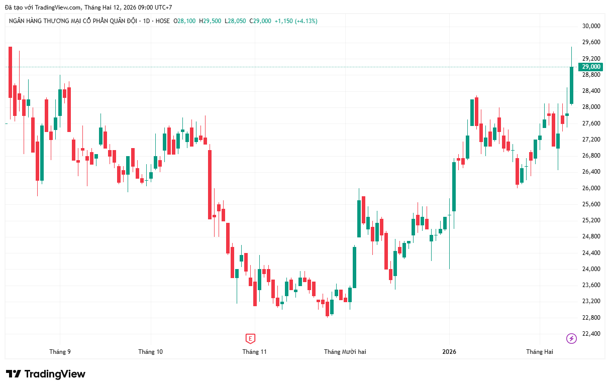 Lực cầu quy mô lớn nhanh chóng tạo hiệu ứng lên thị giá. Kết phiên 11/02/2026, MBB tăng hơn 4%, lên 29.000 đồng/cp - mức cao nhất kể từ khi niêm yết. Thanh khoản bùng nổ với gần 105 triệu cổ phiếu được sang tay, ghi nhận mức cao nhất trong 6 tháng.