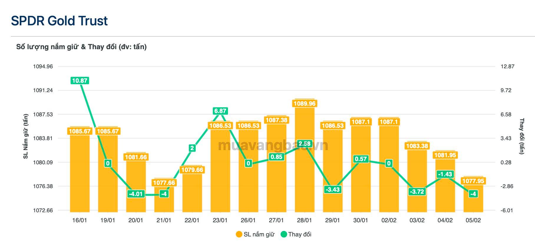 Quỹ ETF vàng lớn nhất thế giới SPDR Gold Shares tiếp tục bán ra 4 tấn vàng trong phiên 5/2, qua đó hạ lượng nắm giữ xuống còn hơn 1.077 tấn, theo dữ liệu từ muavangbac.vn. Đây là phiên bán ròng thứ ba liên tiếp, nâng tổng lượng vàng SPDR xả ra trong 3 phiên gần nhất lên gần 10 tấn.