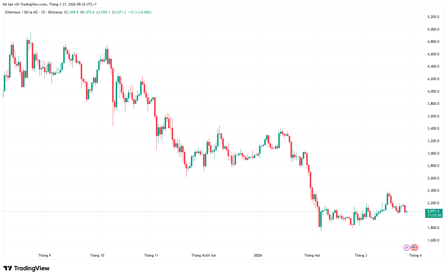 Thị trường tiền điện tử tiếp tục chứng kiến áp lực đối với Ether (ETH) khi đồng tiền này chưa thể duy trì các vùng giá cao. Trong những phiên gần đây, ETH giảm khoảng 6%, có thời điểm lùi về quanh 2.050 USD trong bối cảnh tâm lý thị trường trở nên thận trọng hơn.