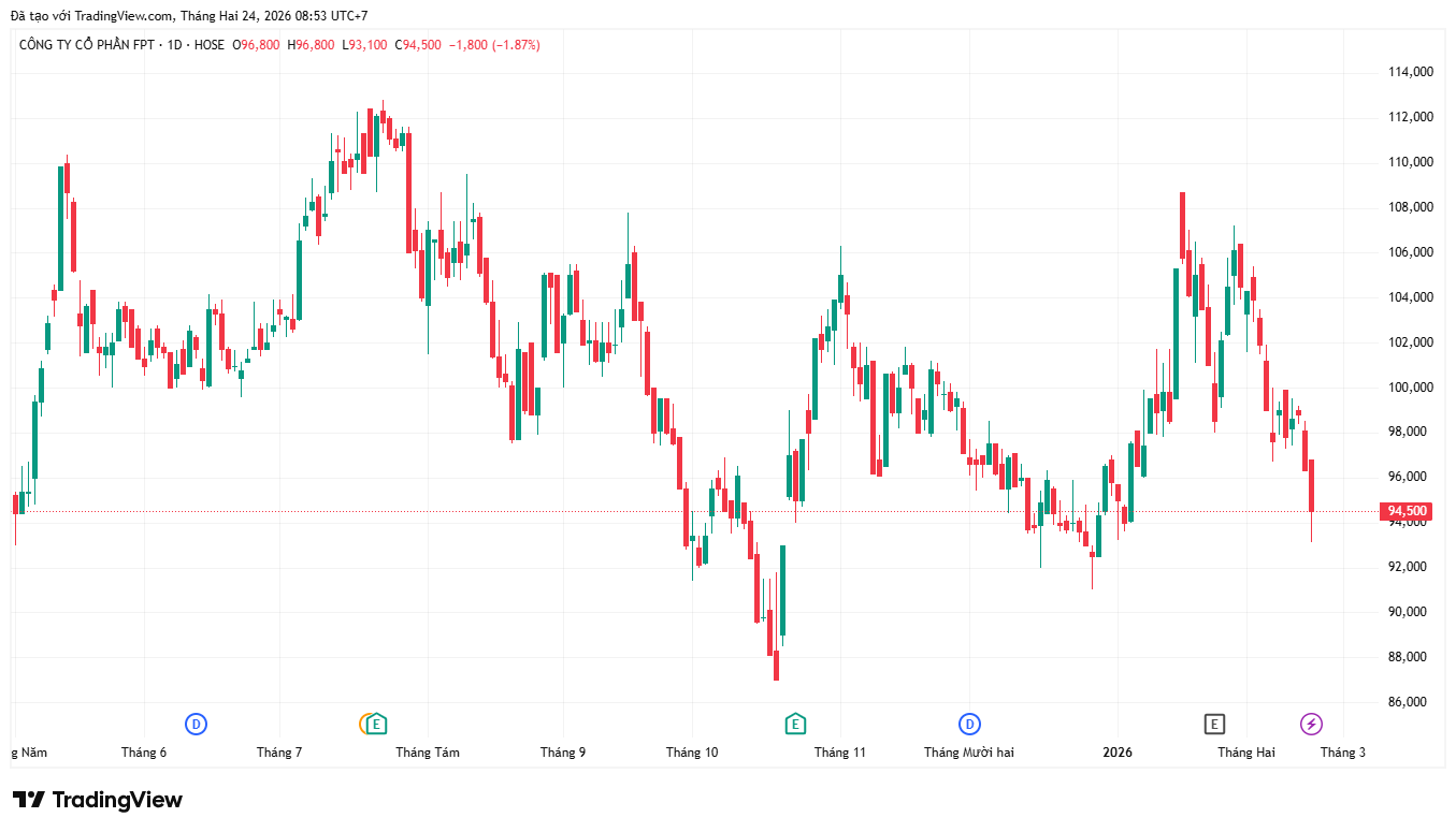 Phiên giao dịch đầu xuân Bính Ngọ 2026 ghi nhận sự hưng phấn lan rộng khi VN-Index tăng hơn 36 điểm, sắc xanh và tím chiếm ưu thế trên diện rộng. Tuy nhiên, cổ phiếu FPT lại đi ngược xu hướng khi giảm 1,9% xuống 94.500 đồng/cổ phiếu, mức thấp nhất kể từ đầu tháng 1. Vốn hóa thị trường theo đó lùi về khoảng 160.000 tỷ đồng.