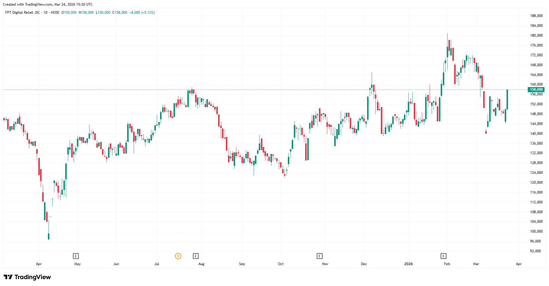 Trên thị trường, cổ phiếu FRT hiện giao dịch quanh mức hơn 153.000 đồng/cổ phiếu, giảm gần 10% trong vòng một tháng trở lại đây. Diễn biến điều chỉnh của thị giá phản ánh tâm lý thận trọng của nhà đầu tư, trong khi doanh nghiệp vẫn theo đuổi chiến lược tăng trưởng và mở rộng quy mô trong trung và dài hạn.