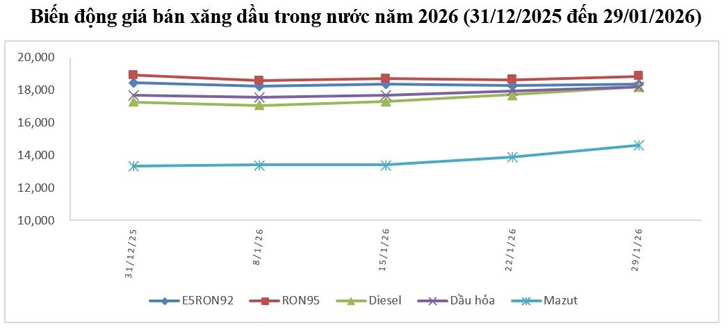 Biến động giá bán xăng dầu trong nước từ ngày 31/12/2025 đến ngày 29/1/2026 - Ảnh: Cục Quản lý và Phát triển thị trường trong nước.
