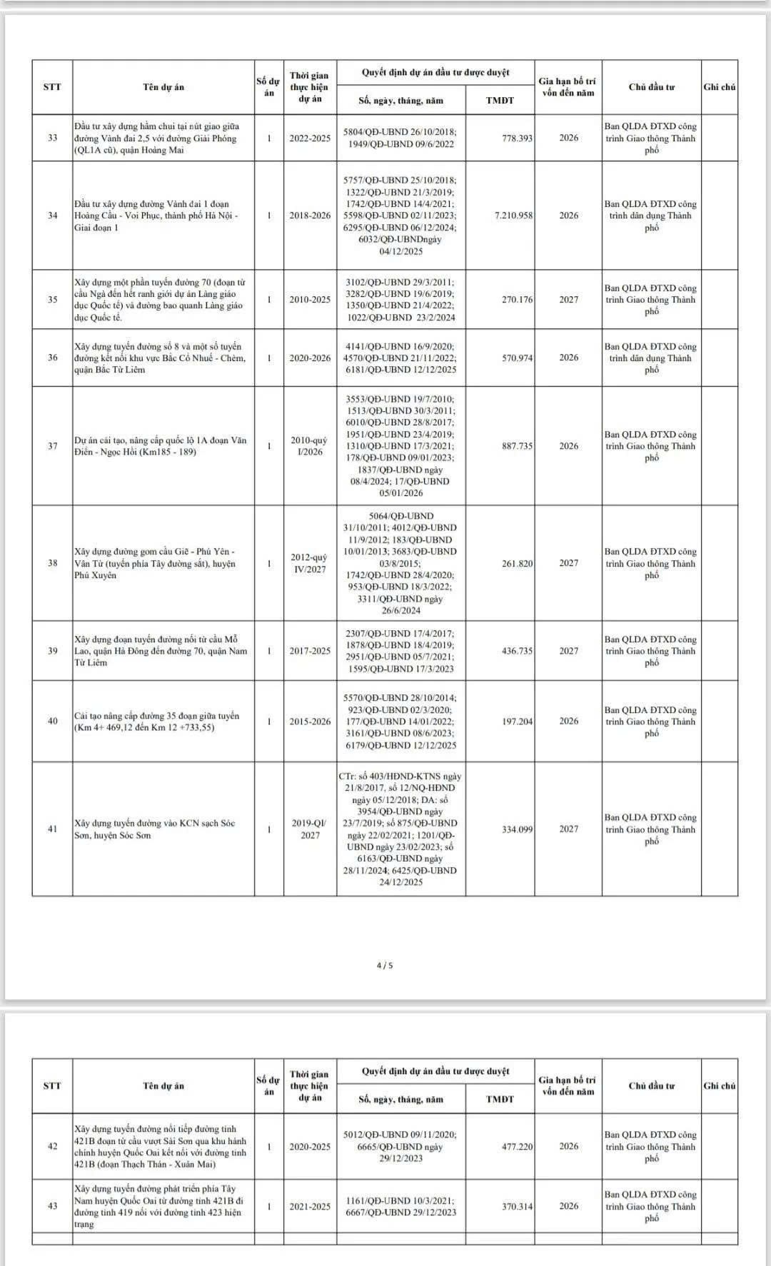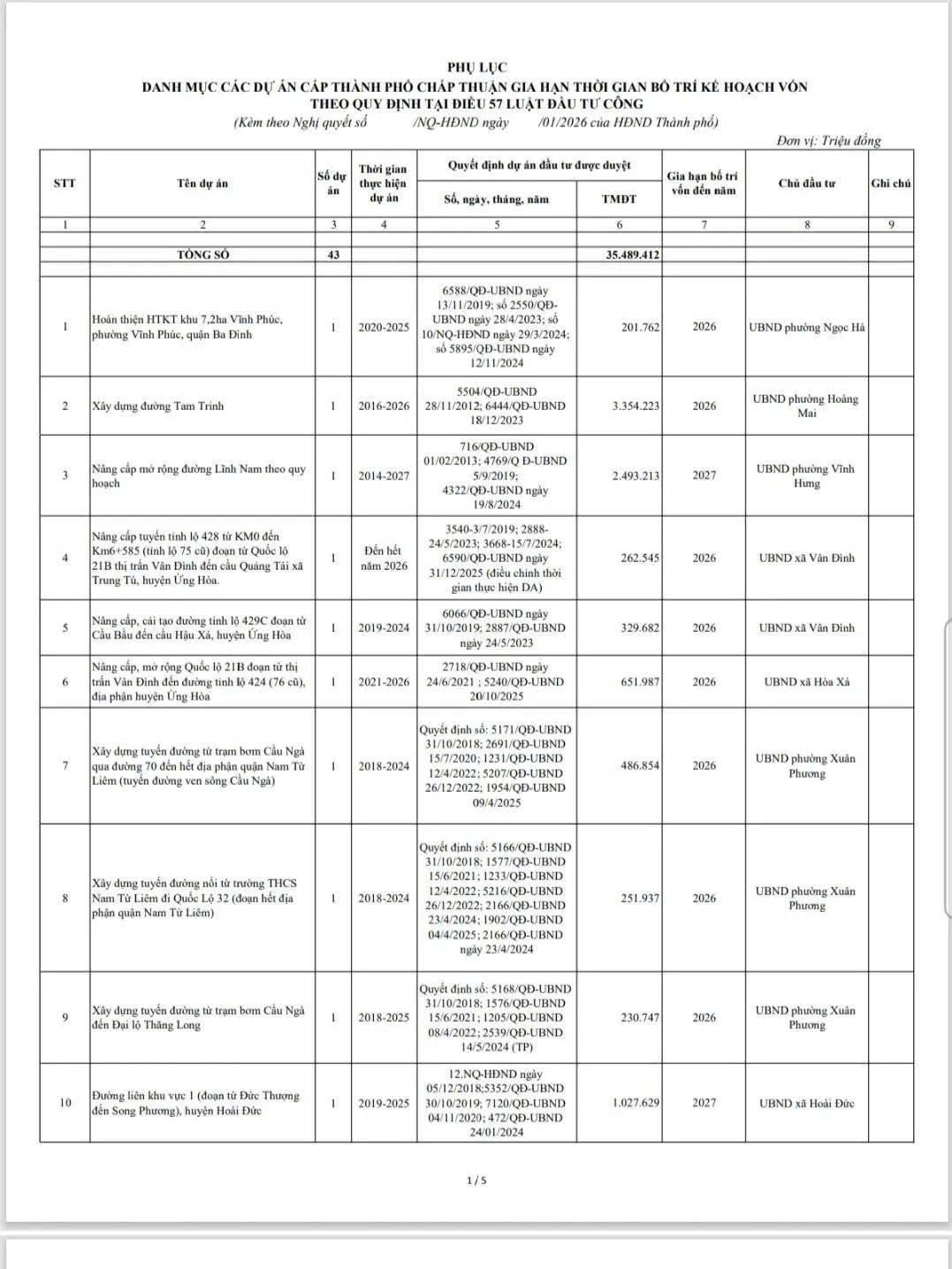 HĐND TP chấp thuận tiếp tục bố trí kế hoạch vốn đối với các dự án cấp Thành phố nhóm A, B, C đã quá thời gian bố trí vốn theo quy định tại điểm d khoản 3 Điều 57 Luật Đầu tư công (được sửa đổi bởi Khoản 25 Điều 7 Luật số 90 sửa đổi 9 Luật). Cụ thể như sau: