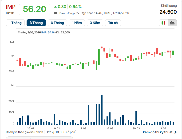 Trên thị trường chứng khoán, cổ phiếu IMP giao dịch quanh vùng 56.200 đồng/cổ phiếu trong phiên giao dịch 17/4. So với mức đỉnh thiết lập hồi tháng 3, thị giá hiện đã điều chỉnh nhẹ khoảng 1,4%, trong bối cảnh nhà đầu tư theo dõi sát diễn biến của thương vụ chào mua và các thay đổi về cơ cấu cổ đông.