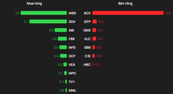 Trên HNX, khối ngoại mua ròng 127 tỷ đồng, chủ yếu tập trung ở PVS (88 tỷ đồng), IDC (30 tỷ đồng) và SHS (27 tỷ đồng). UPCOM ghi nhận mức mua ròng nhẹ hơn 3 tỷ đồng, với MSR và DDV dẫn dắt, cho thấy dòng vốn ngoại vẫn có sự chọn lọc thay vì rút lui hoàn toàn.
