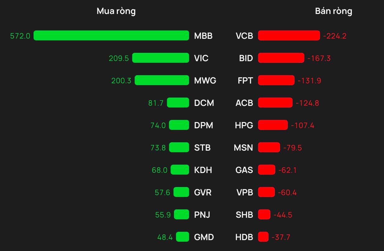 Ở chiều mua, MBB dẫn đầu với giá trị mua ròng khoảng 572 tỷ đồng, bỏ xa các mã còn lại. Theo sau là VIC (khoảng 210 tỷ đồng) và MWG (xấp xỉ 200 tỷ đồng). Nhóm phân bón cũng ghi nhận lực mua đáng kể tại DCM (khoảng 82 tỷ đồng) và DPM (khoảng 74 tỷ đồng).