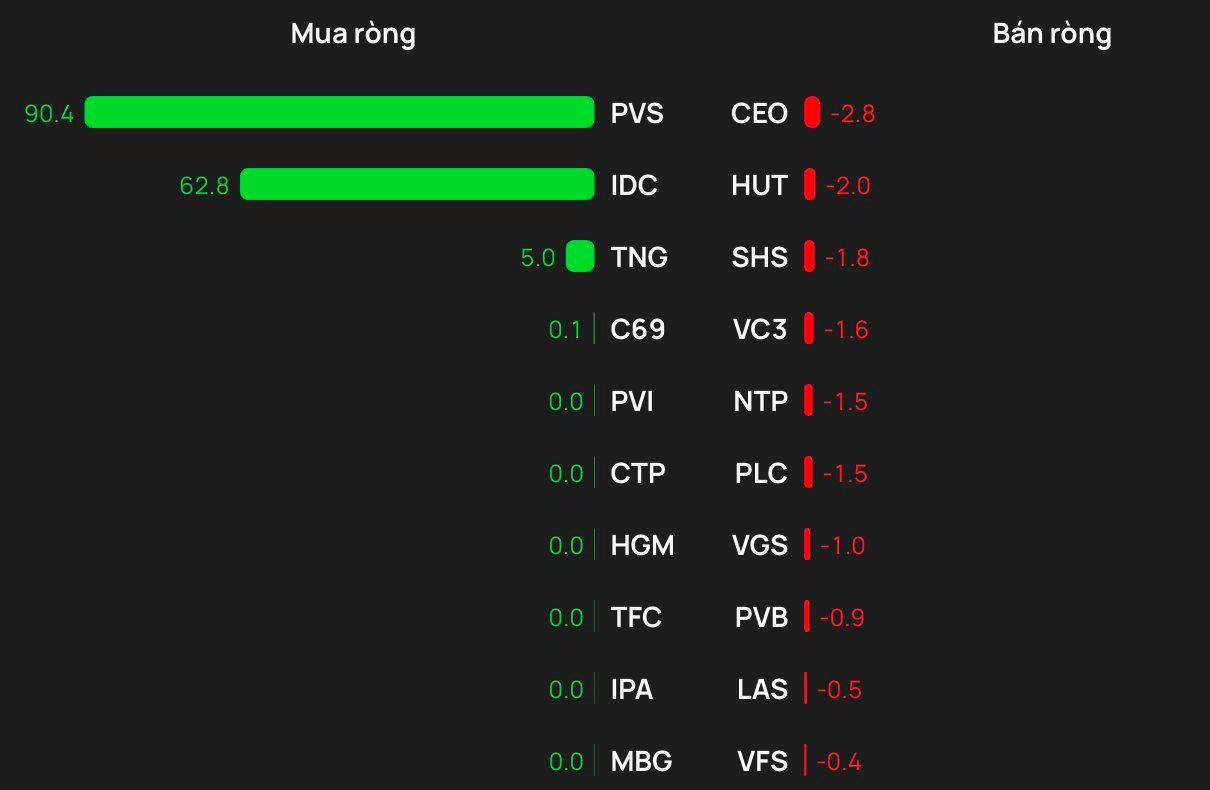 Khối ngoại mua ròng mạnh nhất tại PVS với khoảng 90 tỷ đồng, theo sau là IDC (xấp xỉ 63 tỷ đồng) và TNG (khoảng 5 tỷ đồng).