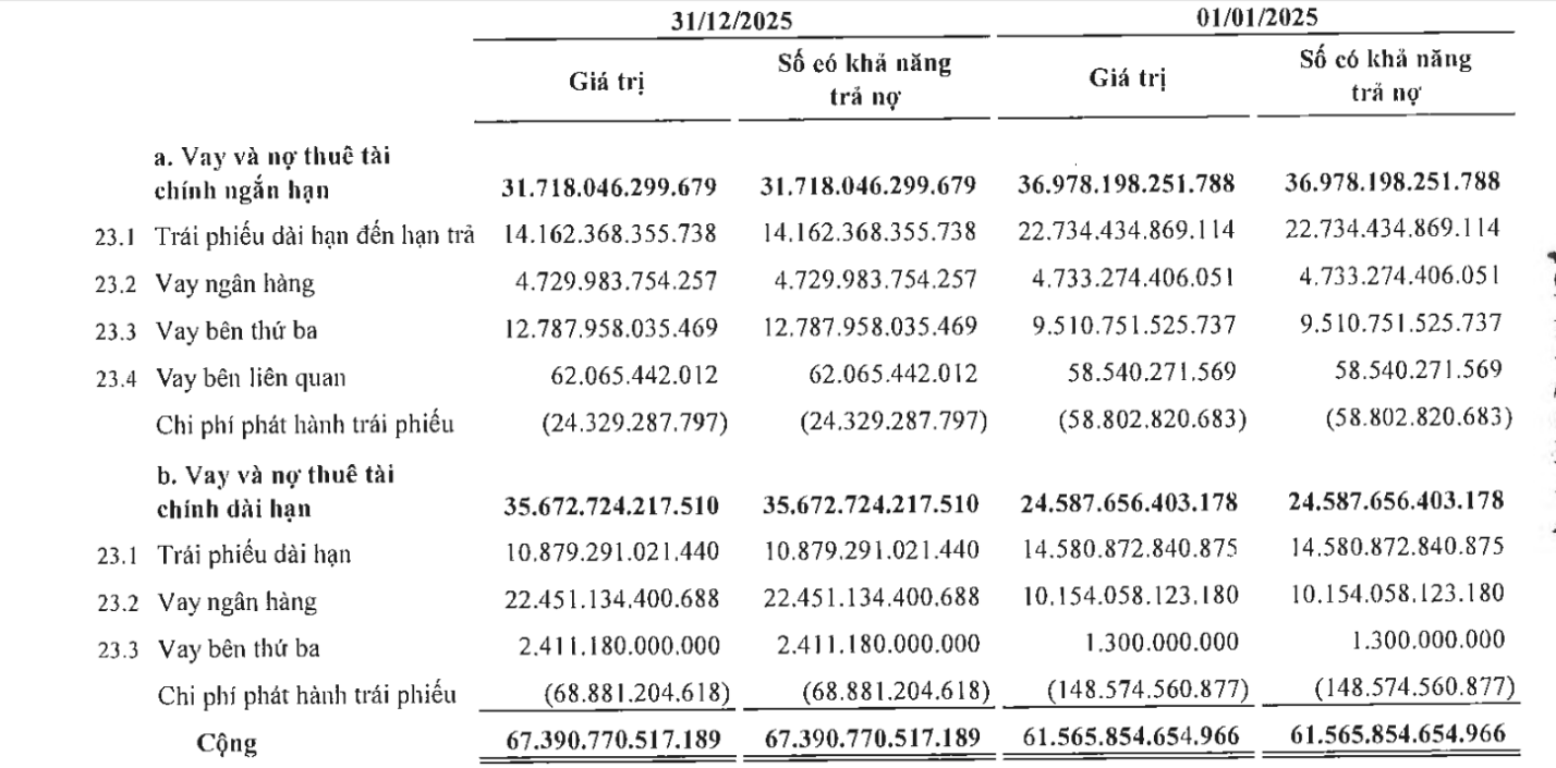 Cơ cấu nợ cho thấy sự dịch chuyển theo hướng kéo dài kỳ hạn. Nợ dài hạn tăng lên 35.673 tỷ đồng, trong khi nợ ngắn hạn giảm xuống 31.718 tỷ đồng. Dư nợ trái phiếu chiếm hơn 37% tổng nợ, vay ngân hàng hơn 40%, còn lại là các khoản vay từ bên thứ ba, phản ánh sự đa dạng hóa nguồn vốn nhưng cũng đi kèm nghĩa vụ tài chính lớn.