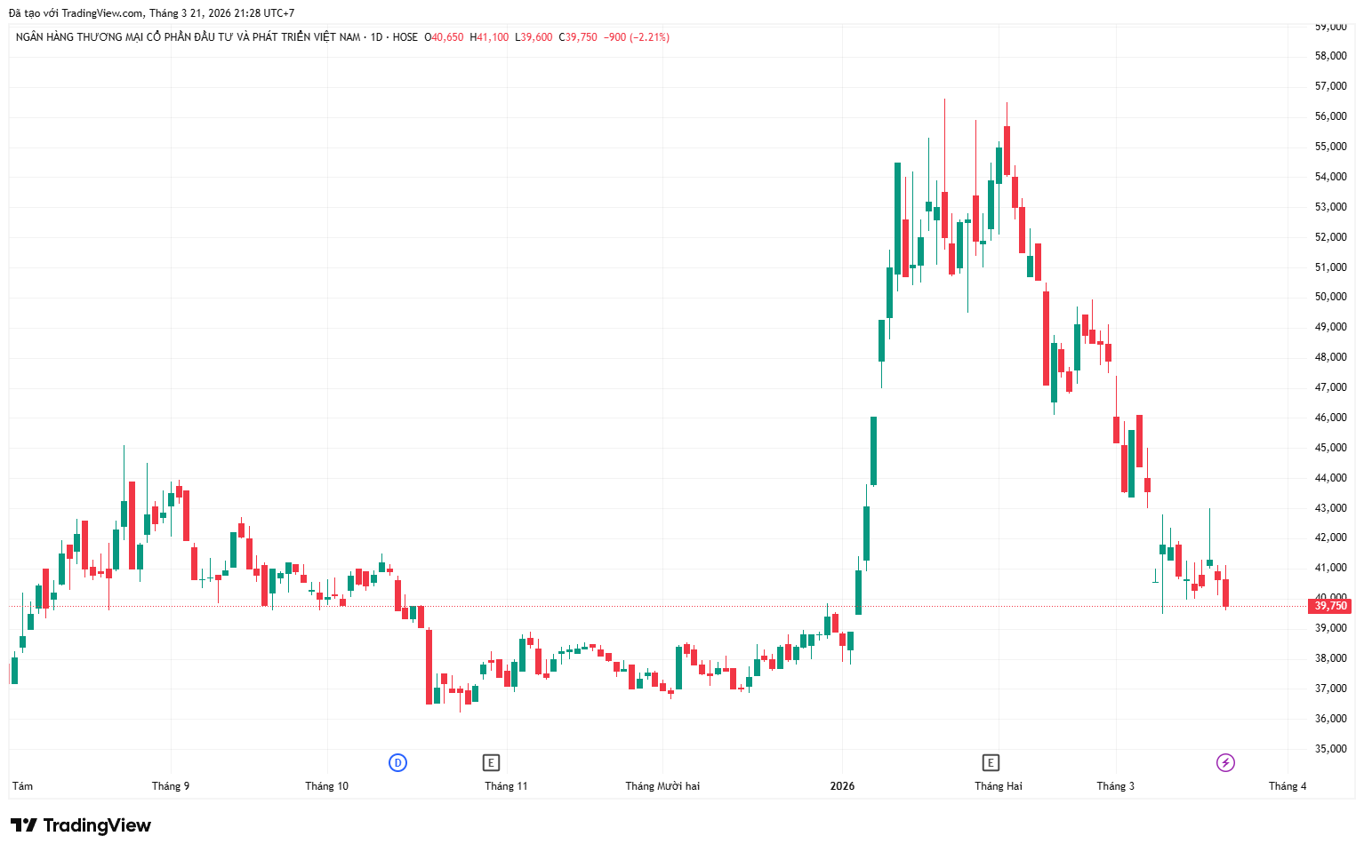 Phiên giao dịch ngày 20/03, cổ phiếu BID của Ngân hàng TMCP Đầu tư Phát triển Việt Nam giao dịch quanh mức 40.000 đồng/cp. So với vùng đỉnh khoảng 55.000 đồng/cp thiết lập trước đó, thị giá đã điều chỉnh đáng kể và quay về sát vùng đáy của năm 2025. Diễn biến này cho thấy sự phân kỳ giữa kết quả kinh doanh và phản ứng của thị trường.