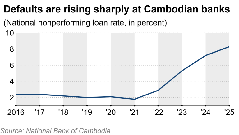 Dữ liệu cho thấy rủi ro không hoàn toàn mang tính cá biệt. Theo Ngân hàng Quốc gia Campuchia (NBC), tỷ lệ nợ xấu toàn ngành đã tăng từ 2,1% năm 2020 lên 8,3% năm 2025, tức gần 300% trong 5 năm. Một số ngân hàng như Prince Bank (28%) và Hattha Bank (35,6%) ghi nhận mức cao hơn, cho thấy áp lực tài sản đang tích tụ.