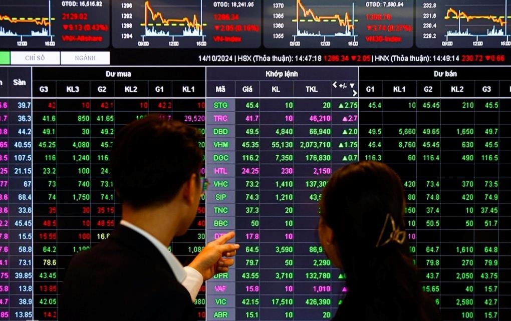Nhà đầu tư đang quan sát bảng điện tử tại trụ sở của một công ty chứng khoán ở TP.HCM. Ảnh: An Khương