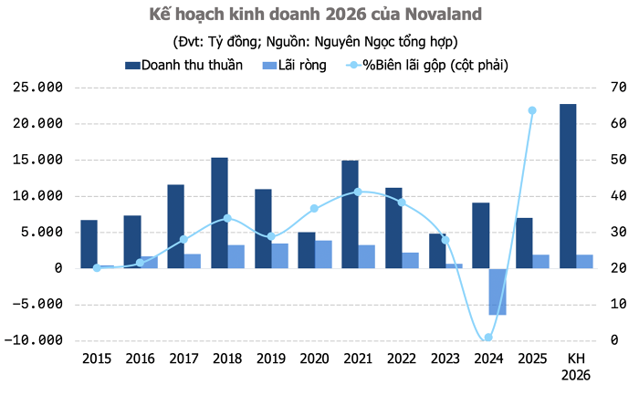 CTCP Tập đoàn Đầu tư Địa ốc No Va (Novaland - NVL) vừa công bố tài liệu họp ĐHĐCĐ thường niên 2026, dự kiến tổ chức ngày 23/04 tại NovaWorld Phan Thiet. Doanh nghiệp đặt kế hoạch doanh thu 22.715 tỷ đồng, tăng hơn 3 lần so với năm 2025, trong khi lợi nhuận sau thuế đạt 1.852 tỷ đồng, gần như đi ngang. Công ty cũng cho biết sẽ không chia cổ tức cho cả hai năm 2025 và 2026 nhằm ưu tiên nguồn lực cho tái cấu trúc tài chính.