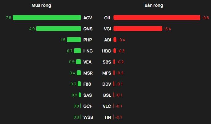 Trên UPCOM, khối ngoại mua ròng khoảng 1 tỷ đồng. ACV được mua ròng 7,5 tỷ đồng, trong khi QNS và PHP chỉ ghi nhận giá trị mua ròng khiêm tốn. Ở chiều ngược lại, OIL bị bán ròng khoảng 10 tỷ đồng.