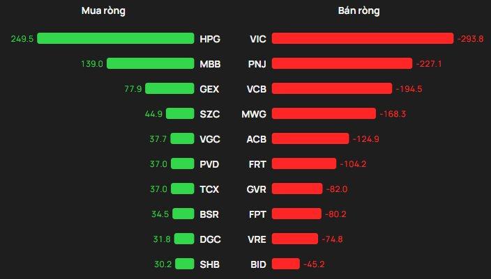 Ở chiều ngược lại, dòng vốn ngoại vẫn cho thấy sự chọn lọc. HPG được mua ròng mạnh nhất với hơn 250 tỷ đồng. MBB và GEX lần lượt được gom 139 tỷ và 78 tỷ đồng, qua đó phần nào cân bằng lực bán chung trên sàn.