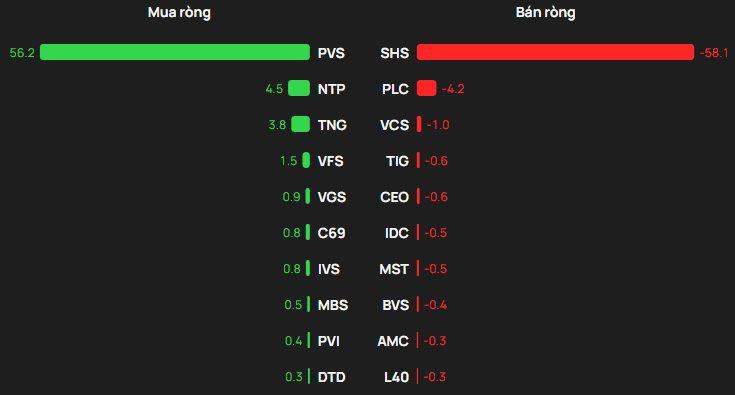 Ở chiều bán, SHS chịu áp lực lớn nhất với giá trị bán ròng gần 58 tỷ đồng; các mã còn lại như PLC, VCS, TIG, CEO bị bán ròng ở mức thấp hơn.