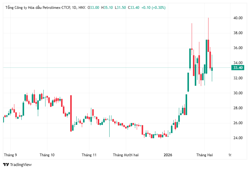Trên thị trường chứng khoán, diễn biến cổ phiếu PLC lại đi ngược với bức tranh lợi nhuận. Sau giai đoạn tăng mạnh và lập đỉnh 37.100 đồng/cổ phiếu ngày 3/2/2026, cổ phiếu này đã bước vào nhịp điều chỉnh, giao dịch quanh vùng 34.500 đồng/cổ phiếu trong phiên 6/2/2026, song thanh khoản vẫn duy trì ở mức cao so với trung bình nhiều năm.