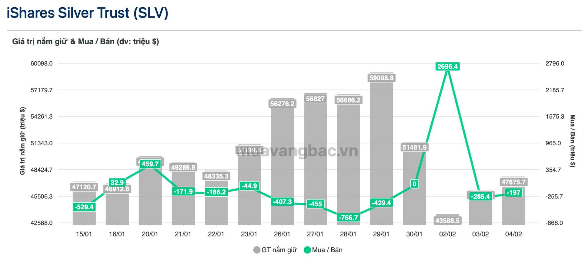 Chỉ trong hai phiên, quỹ bán ra khoảng 130 tấn bạc, giá trị ước gần 500 triệu USD. Tính đến ngày 4/2, SLV vẫn nắm gần 16.400 tấn bạc, quy mô tài sản khoảng 47,7 tỷ USD – cho thấy động thái này mang tính điều chỉnh vị thế hơn là rút lui khỏi thị trường.