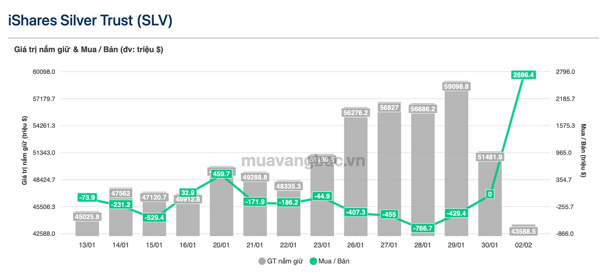 Quỹ iShares Silver Trust (SLV) – quỹ ETF bạc vật chất lớn nhất thế giới – ghi nhận dòng tiền mua ròng gần 3 tỷ USD trong phiên 2/2, thời điểm thị trường bạc biến động mạnh sau khi giá giảm sâu. Mức mua ròng này, tương đương tổng giá trị bạc mà quỹ đã bán ra từ đầu năm đến nay.