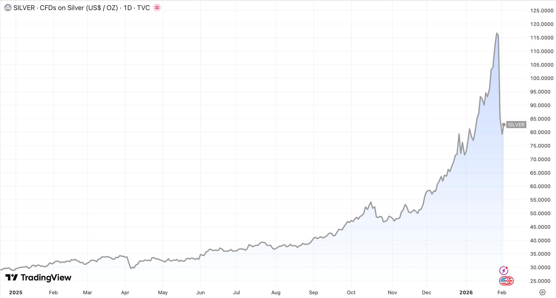 Sau đợt bán tháo, giá bạc đã hồi phục trở lại trên vùng 80 USD/ounce, nhưng vẫn thấp hơn đáng kể so với mức đỉnh trên 120 USD/ounce thiết lập vào cuối tháng 1.