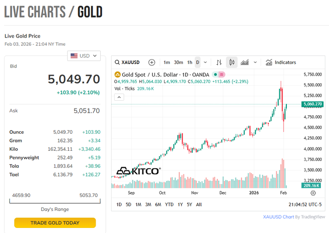 Trên thị trường thế giới, giá vàng giao ngay ghi nhận lúc 9h giao dịch quanh mức 5.050 USD/ounce, tăng 2,1% so với mức đóng cửa hôm qua. Trước đó, giá vàng đã tăng 6,13% trong phiên giao dịch 3/2, sau 2 phiên giảm mạnh liên tiếp.