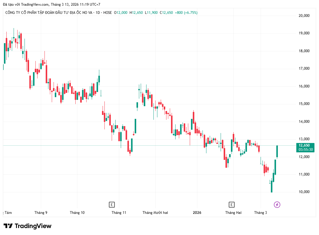 Sau chuỗi 6 phiên giảm liên tiếp từ cuối tháng 02 đến đầu tháng 03/2026, cổ phiếu NVL của Novaland đã đảo chiều tăng mạnh. Trong phiên sáng 13/03, mã này tăng trần lên 12.650 đồng/cổ phiếu, đưa vốn hóa doanh nghiệp lên hơn 28.200 tỷ đồng.