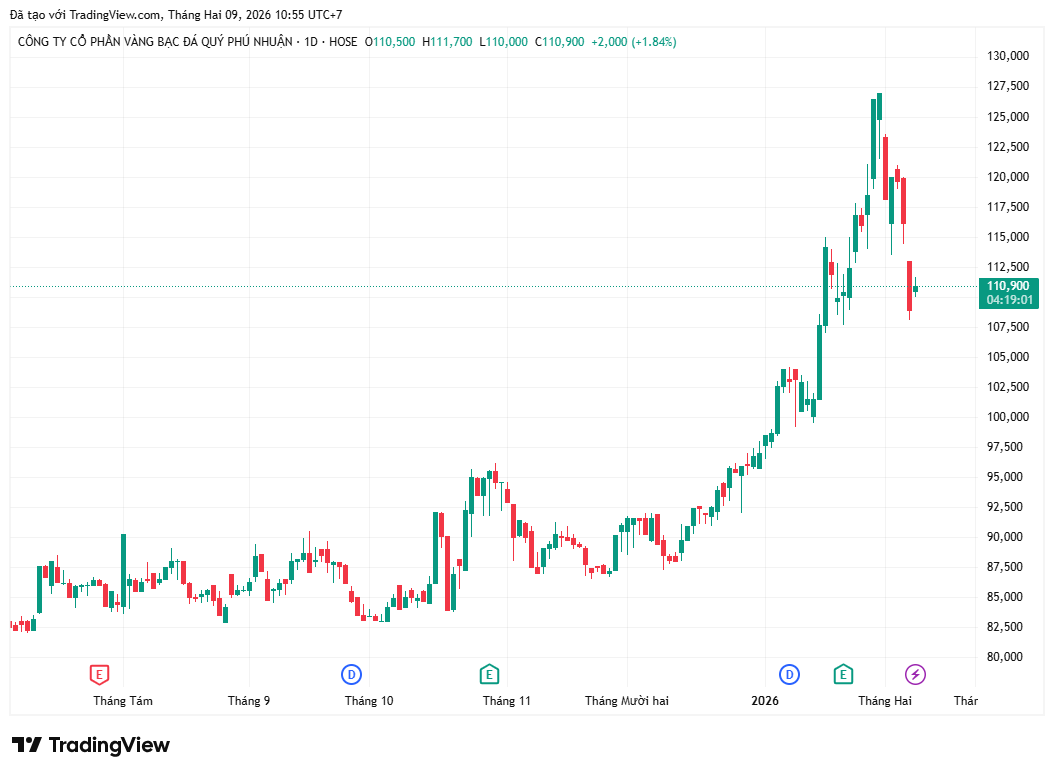 Sau nhiều tháng lình xình quanh vùng 85.000 đồng/cổ phiếu, mã PNJ của CTCP Vàng bạc Đá quý Phú Nhuận đã có giai đoạn tăng giá rất mạnh trong tháng 12/2025 và tháng 01/2026. Thị giá leo lên mức đỉnh lịch sử 127.000 đồng/cổ phiếu, tương ứng mức tăng khoảng 49% trong vòng hai tháng, trước khi điều chỉnh về quanh 109.000 đồng/cổ phiếu đầu tháng 02/2026. Diễn biến này cho thấy tâm lý chốt lời đã xuất hiện khi mặt bằng giá mới được thiết lập khá nhanh.