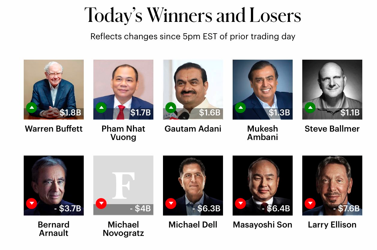 Cụ thể, tài sản của ông Phạm Nhật Vượng tăng thêm 1,7 tỷ USD chỉ trong một ngày, trong khi Warren Buffett ghi nhận mức tăng 1,8 tỷ USD. Đây là mức biến động đáng chú ý, đưa cả hai vào top 5 tỷ phú tăng tài sản mạnh nhất toàn cầu trong phiên.
