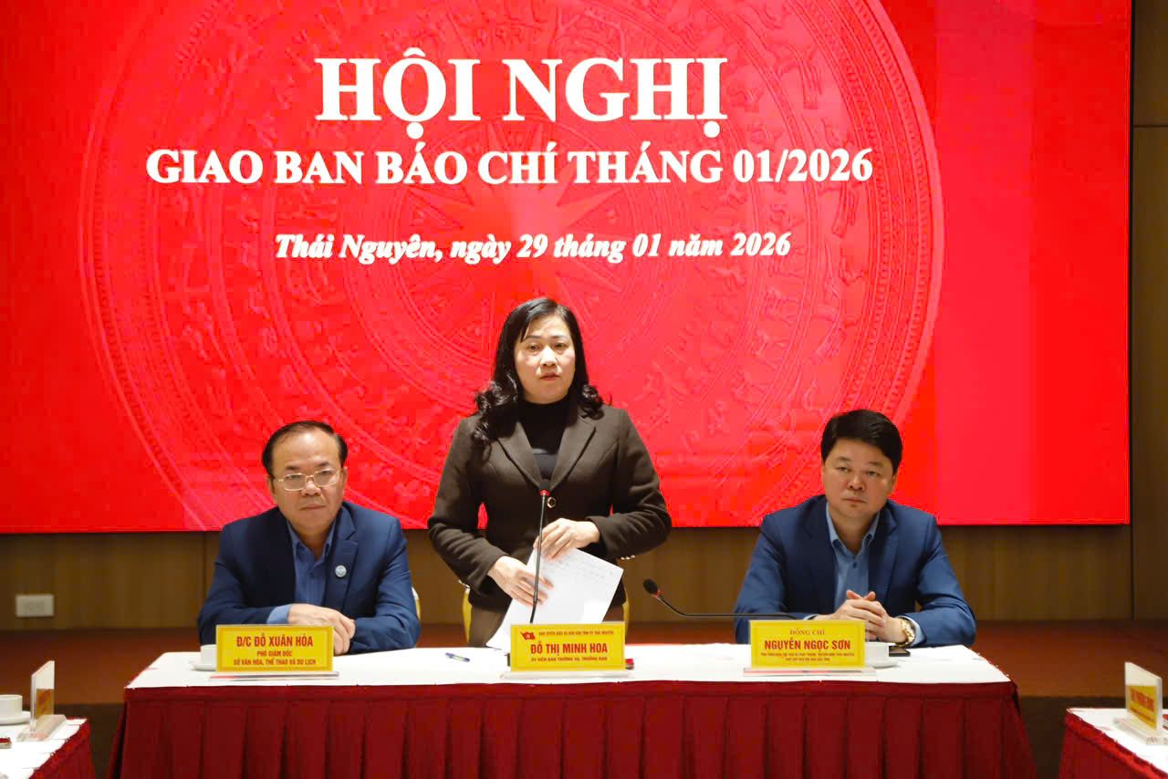 Chiều 29/01, tại Hội trường Tòa tháp đôi Prime, phường Hoàng Văn Thụ, tỉnh Thái Nguyên, Ban Tuyên giáo và Dân vận Tỉnh ủy chủ trì phối hợp cùng Sở Văn hóa, Thể thao và Du lịch, Hội Nhà báo tỉnh tổ chức Hội nghị giao ban báo chí tháng 01/2026.