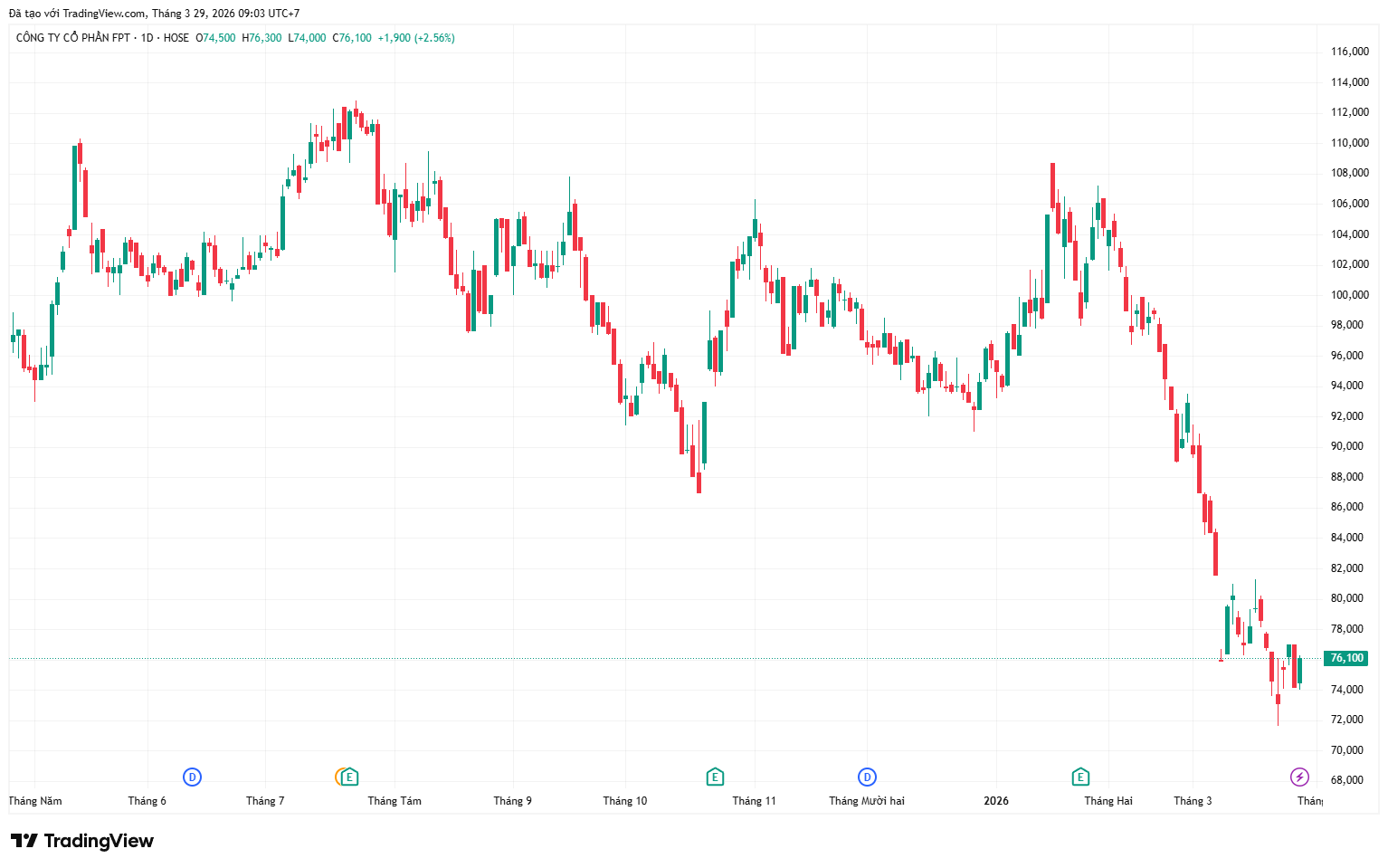 Trên thị trường chứng khoán, cổ phiếu FPT trong tháng 3/2026 ghi nhận nhịp điều chỉnh đáng kể trước khi có dấu hiệu phục hồi vào cuối tháng. Giá cổ phiếu giảm từ 89.600 đồng/cổ phiếu (chốt phiên 02/03) xuống 73.100 đồng/cổ phiếu (chốt phiên 23/03), với phiên giảm mạnh nhất vào ngày 09/03.
