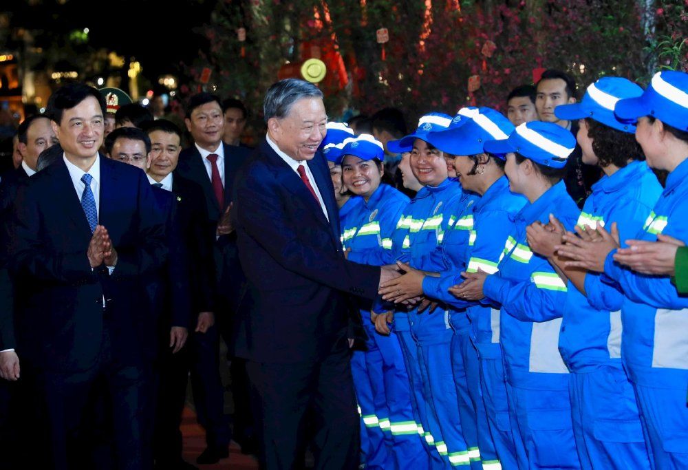 Tiếp đó, Tổng Bí thư Tô Lâm cùng các đồng chí lãnh đạo Trung ương và thành phố Hà Nội đã mừng tuổi, chúc Tết công nhân, người lao động, các chiến sĩ công an, cảnh sát giao thông, đội ngũ công nhân vệ sinh, những người ngày đêm không quản vất vả, làm việc xuyên Tết để giữ gìn bình yên cho nhân dân và môi trường xanh - sạch cho Thủ đô.