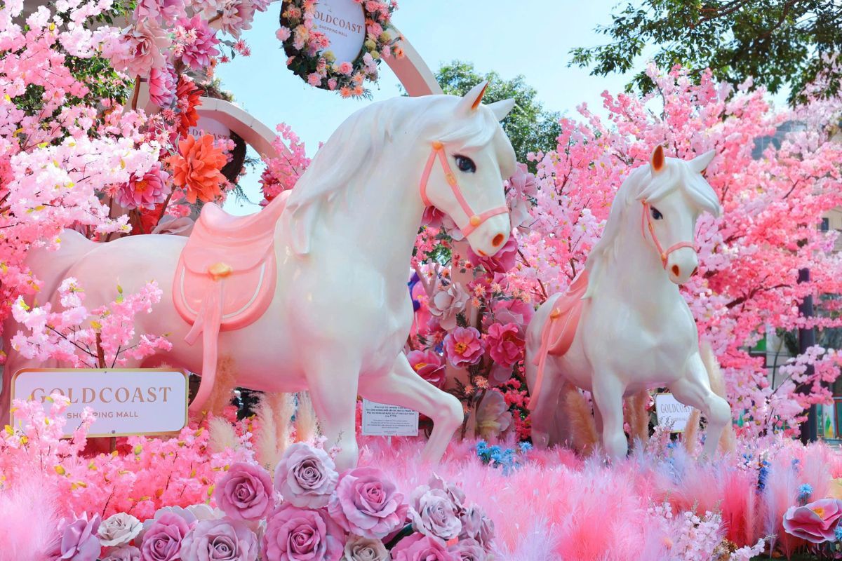 Ở Khánh Hòa, đôi ngựa hồng pastel tại trung tâm thương mại Gold Coast mang vẻ cổ tích
