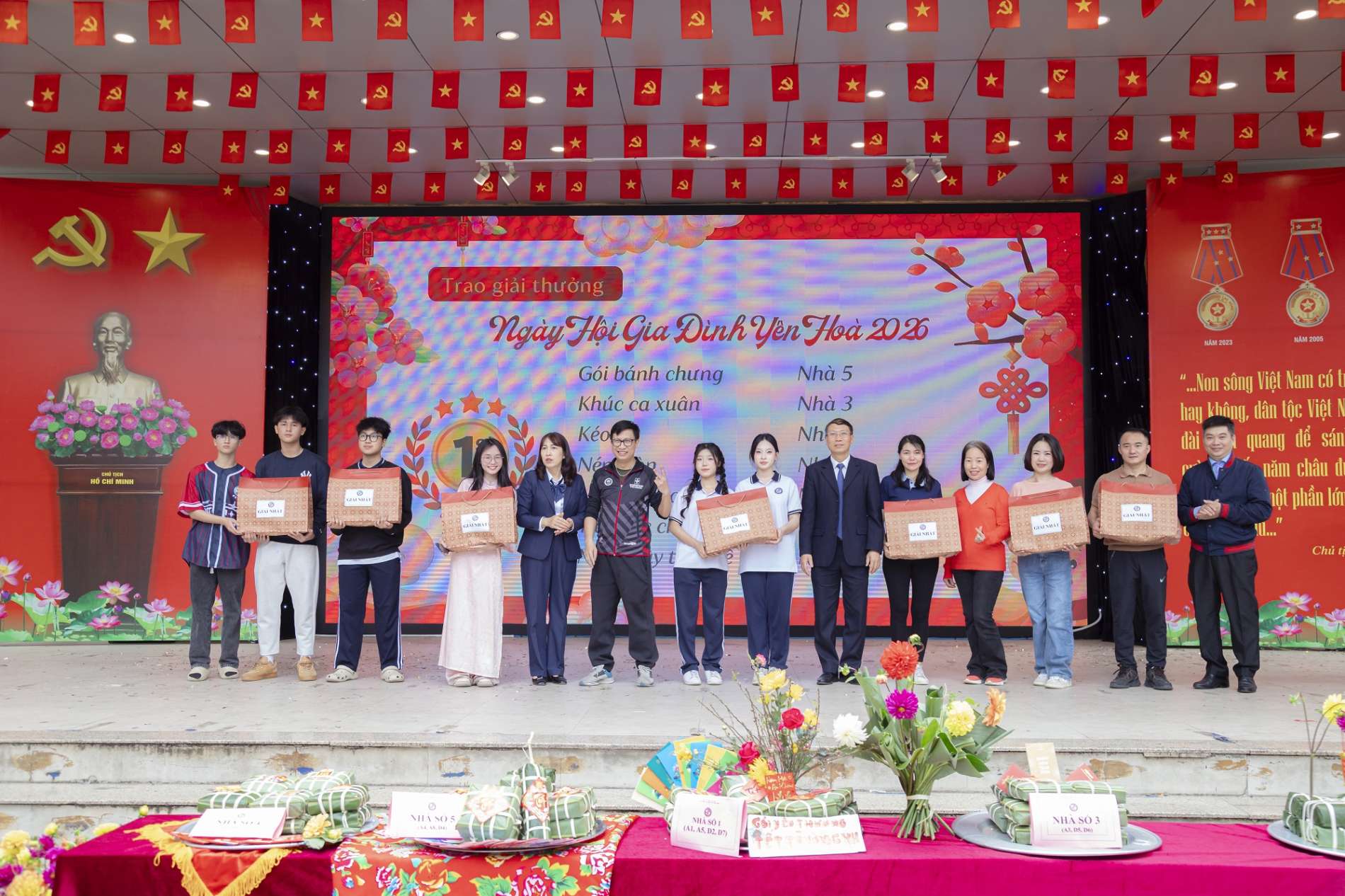Lãnh đạo nhà trường cùng đại diện cha mẹ học sinh trao giải cho các tập thể đạt thành tích cao trong các hoạt động tại Ngày hội gia đình Yên Hòa 2026.